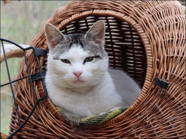 Wanneer hij rustig naar buiten wil kijken, trekt hij zich terug in zijn mand.